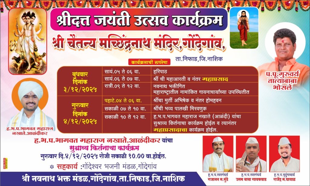 गोंदेगाव (ता.निफाड) येथे श्री चैतन्य मच्छिंद्रनाथ मंदिरात दरवर्षी प्रमाणे यंदाचा श्रीदत्त जयंती उत्सव मोठ्या उत्साहात साजरा होणार आहे. विविध धार्मिक कार्यक्रम, कीर्तन, भजन, महाप्रसाद आणि विशेष धार्मिक उपक्रमांनी सजलेला दोन दिवसांचा हा उत्सव भाविकांसाठी आध्यात्मिक पर्वणी ठरणार आहे. दत्त जयंतीच्या आदल्या दिवशी म्हणजे आज (दि.०३) संध्याकाळी ५ वाजता हरिपाठाने उत्सवाला सुरुवात होणार झाली. ६ वाजता श्रीची महाआरती व महाप्रसादाचे आयोजन करण्यात आले आहे. रात्री ९ ते १२ दरम्यान ‘नवनाथ भक्ती’ कार्यक्रम सादर केला जाणार आहे. हे भक्ती गीते ऐकण्यासाठी महाराष्ट्रातून मोठ्या प्रमाणात भाविक दाखल झाले आहेत. उद्या (दि.०४) पहाटे श्रीदत्त मूर्ती अभिषेक आणि होमहवनाने दिवसाची सुरुवात होणार आहे. त्यानंतर सकाळी १० ते १२ या वेळेत श्रींची भव्य पालखी मिरवणूक निघेल. सकाळी १० वाजता ह.भ.प. भागवत महाराज नखाते यांचे सुश्राव्य कीर्तन होणार असून त्यानंतर महाप्रसादाचे आयोजन आहे. दत्त भक्तांना या सोहळ्याची उत्सुकता असते. उत्सवासाठी गोंदेगाव येथील गोंदेश्वर भजनी मंडळ तसेच अनेक कार्यकर्त्यांनी पुढाकार घेतलाअसून प.पू. गुरुवर्य तात्याबाबा भोसले, ह.भ.प. भागवत महाराज नखाते आणि अन्य मान्यवरांच्या उपस्थितीने हा उत्सव अधिक भव्य होणार आहे.